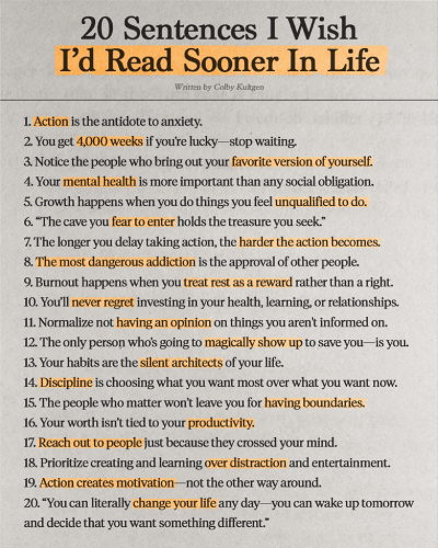 “20 Sentences I Wish I’d Read Sooner in Life” landed in my inbox last week. As I read each one, I found myself nodding my head in agreement. These 20 nuggets of wisdom left me thinking about times in my life when I’d embraced each one, as well as times when I hadn’t and the struggles that ensued.